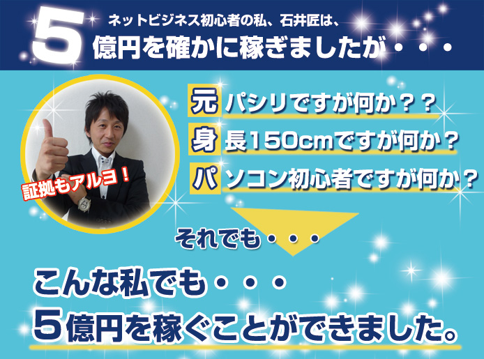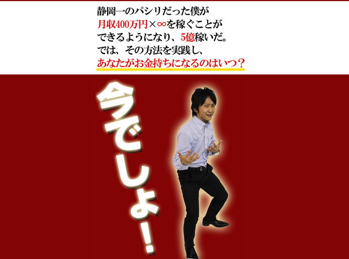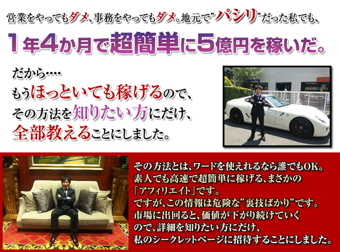 実はダンサーです。 実はアフィリエイターです。 実はダンススタジオ代表です。 踊る証拠映像 http://www.youtube.com/watch?v=tYijbKo-BLg 2013/6/17から始めました。 5日で15万稼ぎました。 始めようとして3年色々な回り道をして始めて 5日で成果爆発ってどうなっているのでしょうか?笑 アフィリエイト初めて解るのでは 攻略は一つの事攻略していますが、アフィリ稼ぐ為には 複合しないと儲からないのです。 僕の全てをブログそしてメルマガで発表してきますねー。 それではよろしくお願いします。